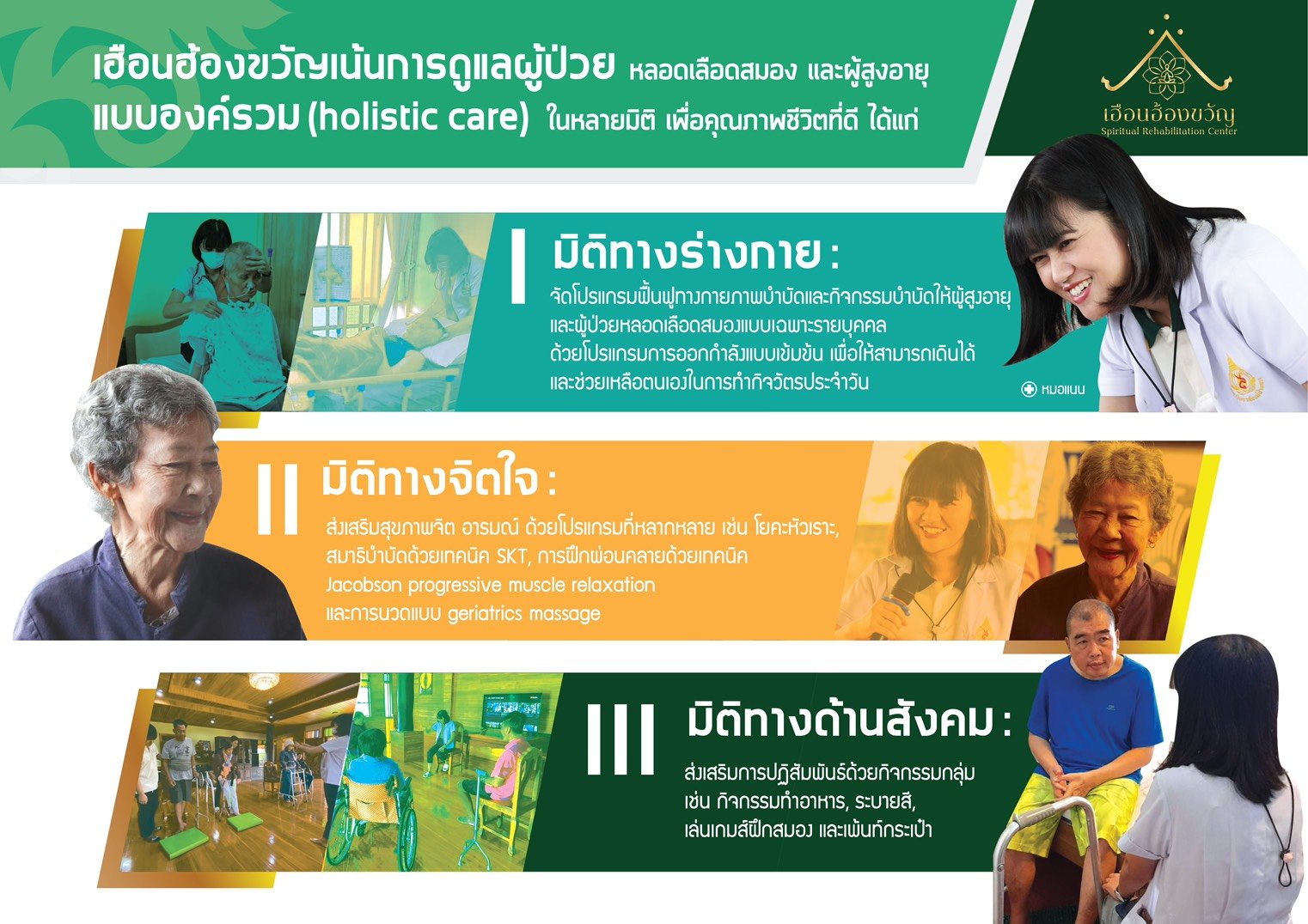 สิ่งที่ศูนย์ฟื้นฟูผู้ป่วย และผู้สูงอายุ เฮือนฮ้องขวัญ ใส่ใจเป็นพิเศษ คือ การดูแลแบบองค์รวม (Holistic Care) ซึ่งผู้ป่วยทุกรายจะมีการทำกิจกรรมบำบัดและกิจกรรมจิตบำบัด เพื่อให้ฟื้นฟูจิตใจให้เข้มแข็ง มีกำลังใจรักษาร่างกายต่อไป